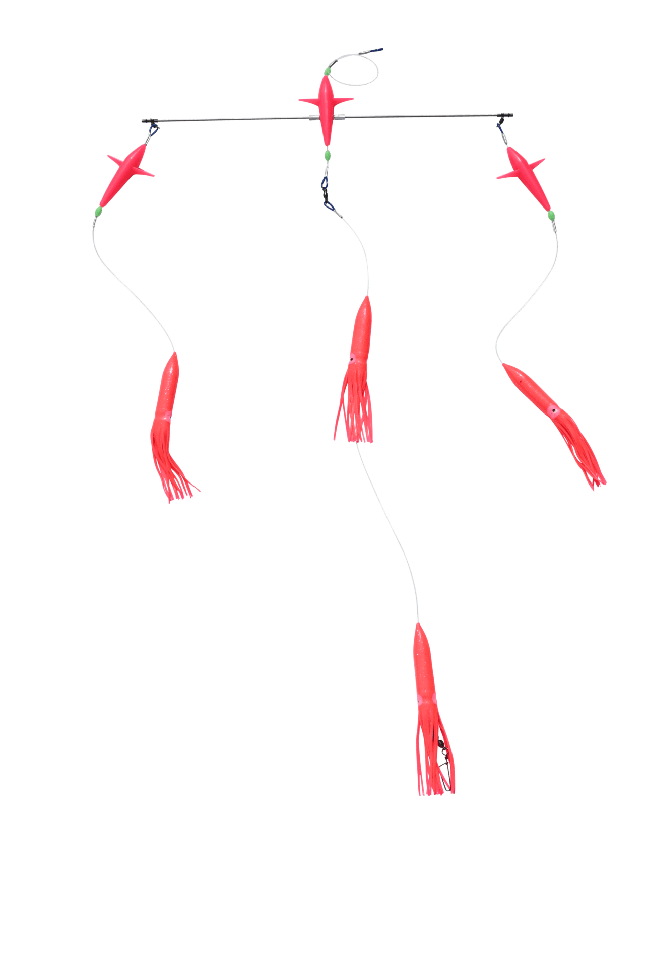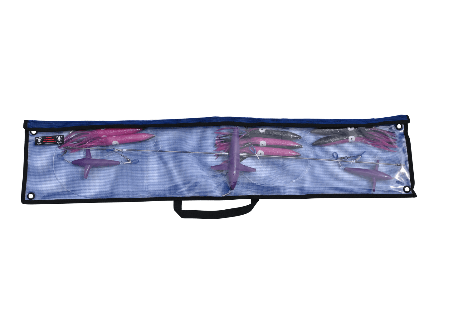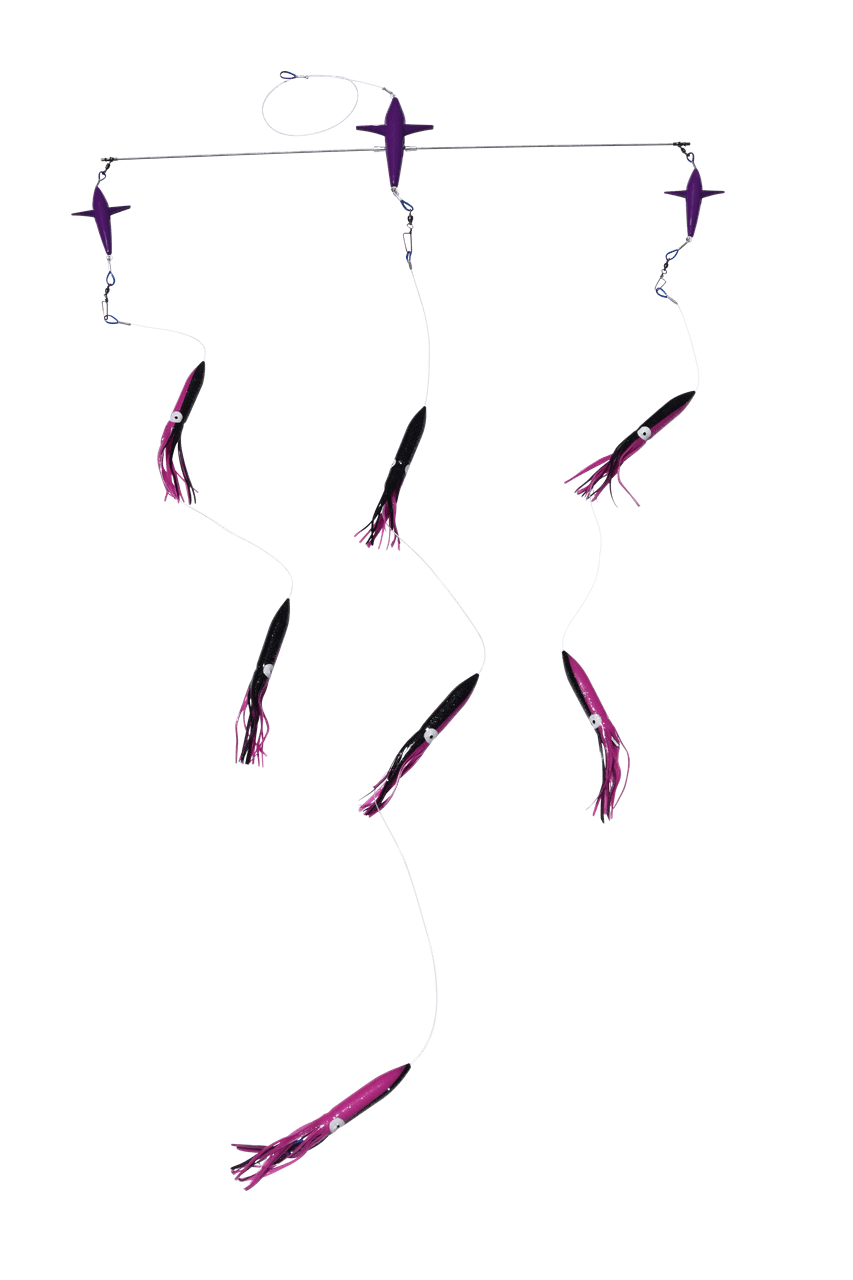 Crafted from titanium, the bar strikes the perfect balance between strength and lightness. The foam-filled squid ensure they stay buoyant on the surface, enhancing the life like appearance. Equipped with a snap swivel at the end, this teaser allows you to attach a lure on the ball bearing clip or even use as just a teaser. The thoughtfully designed spreader bar keeps all components elevated, splashing vigorously, even in rough weather or when trolled well behind the boat. Its versatility shines through with three available sizes–12, 24, and 36inches, catering to various fishing scenarios. Choose from an array of eye-catching colours–pink, green, blue/white and the striking purple/black combination. With the Black Pete Spreader Bar, you're not just trolling; you're orchestrating an underwater spectacle that fish simply can't resist.