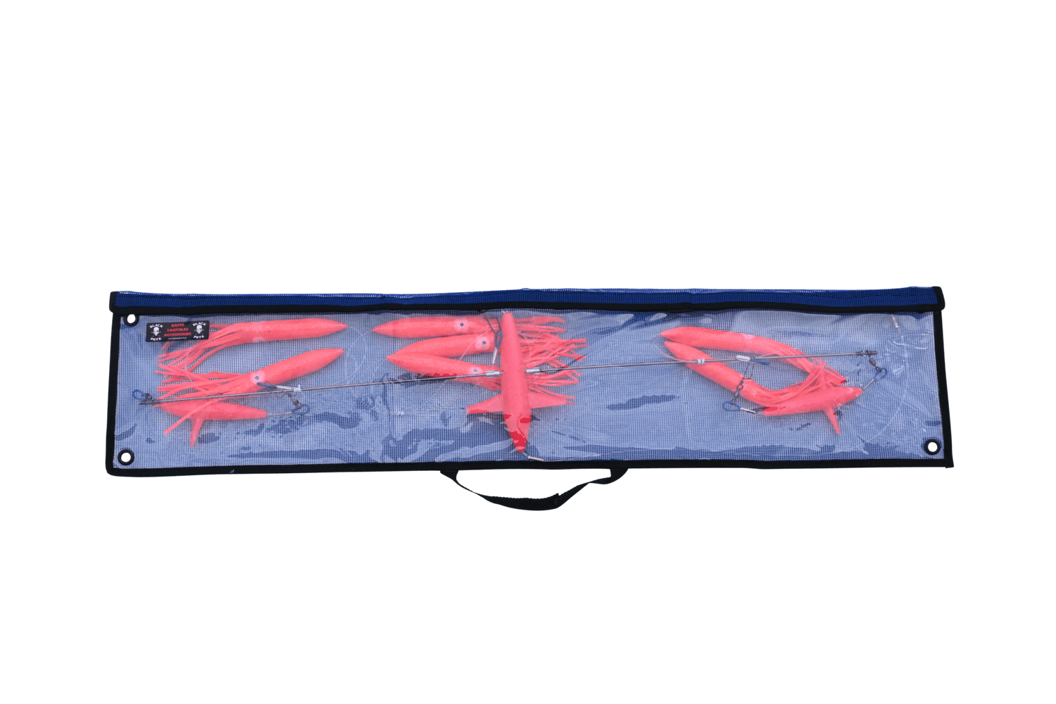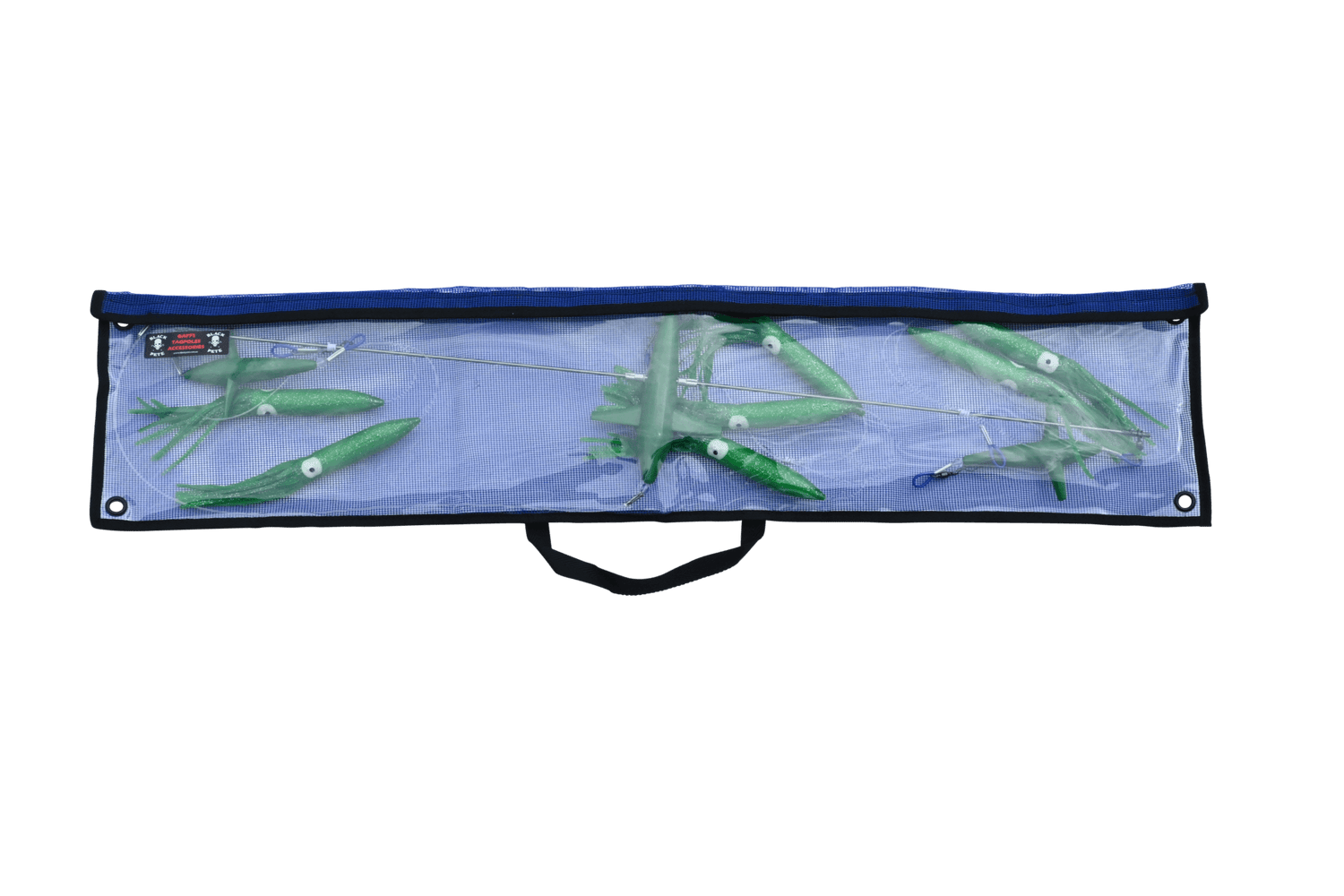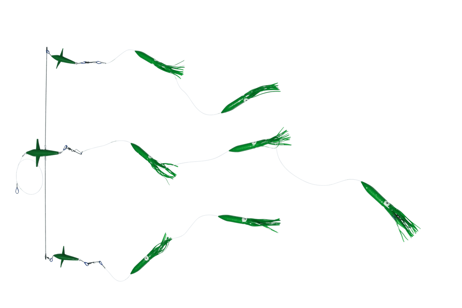 Crafted from titanium, the bar strikes the perfect balance between strength and lightness. The foam-filled squid ensure they stay buoyant on the surface, enhancing the life like appearance. Equipped with a snap swivel at the end, this teaser allows you to attach a lure on the ball bearing clip or even use as just a teaser. The thoughtfully designed spreader bar keeps all components elevated, splashing vigorously, even in rough weather or when trolled well behind the boat. Its versatility shines through with three available sizes–12, 24, and 36inches, catering to various fishing scenarios. Choose from an array of eye-catching colours–pink, green, blue/white and the striking purple/black combination. With the Black Pete Spreader Bar, you're not just trolling; you're orchestrating an underwater spectacle that fish simply can't resist.
