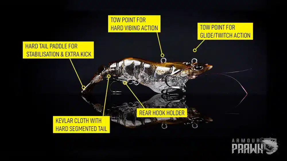 With a unique combination of realism and versatility the all new Armour Prawn is every inshore anglers dream! Available in 110mm (25g) and 85mm (13g) with 2 tow points giving 2 great actions – Hard, tight vibrating action or a gliding and twitching action. The hard segmented tail joined with a Kevlar cloth allows for a natural kick and stable sink whilst the rear hook keeper holds the treble in place. Natural and UV colours, Nylon feelers and painted eyes will make this new range the go-to lure for Fresh and Saltwater fisho’s. Size_ 110 mm (4.25") | Weight_ 25 gm (5/6 oz) Size_ 85 mm (3.25") | Weight_ 13 gm (1/2 oz)