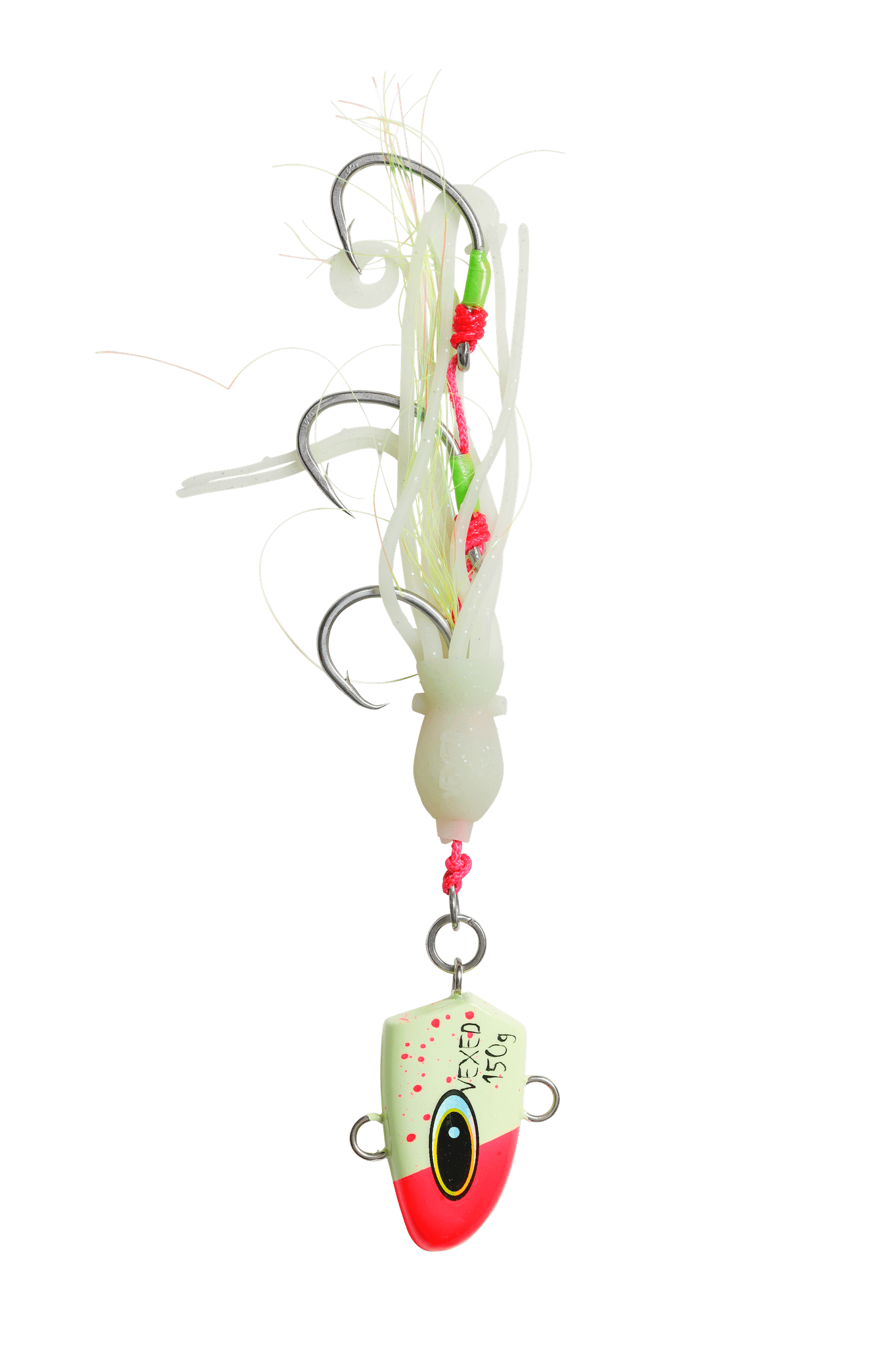 The Vexed Bottom Meat Deluxe is a great crossover concept mixing lure and bait fishing together simply bait up the hooks with a long strip of fish flesh, squid, octopus leg, pilchard or whole fish and send it to the bottom this design is great for any depth of water, The Bottom Meat Deluxe is fitted with super sharp hooks, Japanese assist cord and stainless rings. It now also has a Vexed super stretchy, high intensity glowing scented Occy Head Skirt with a burst of UV flash.