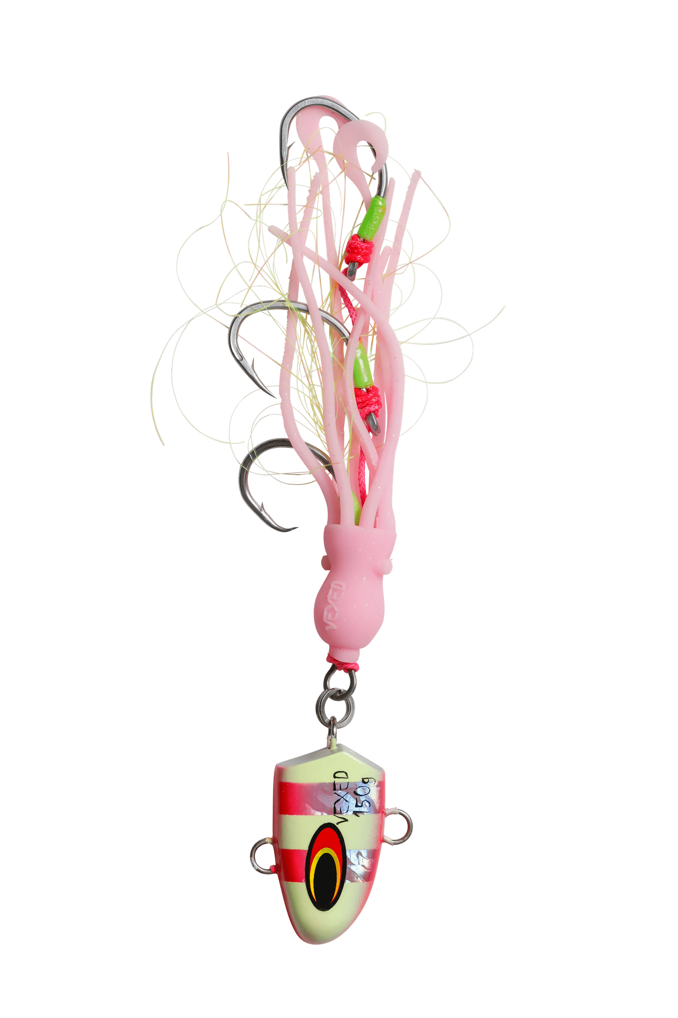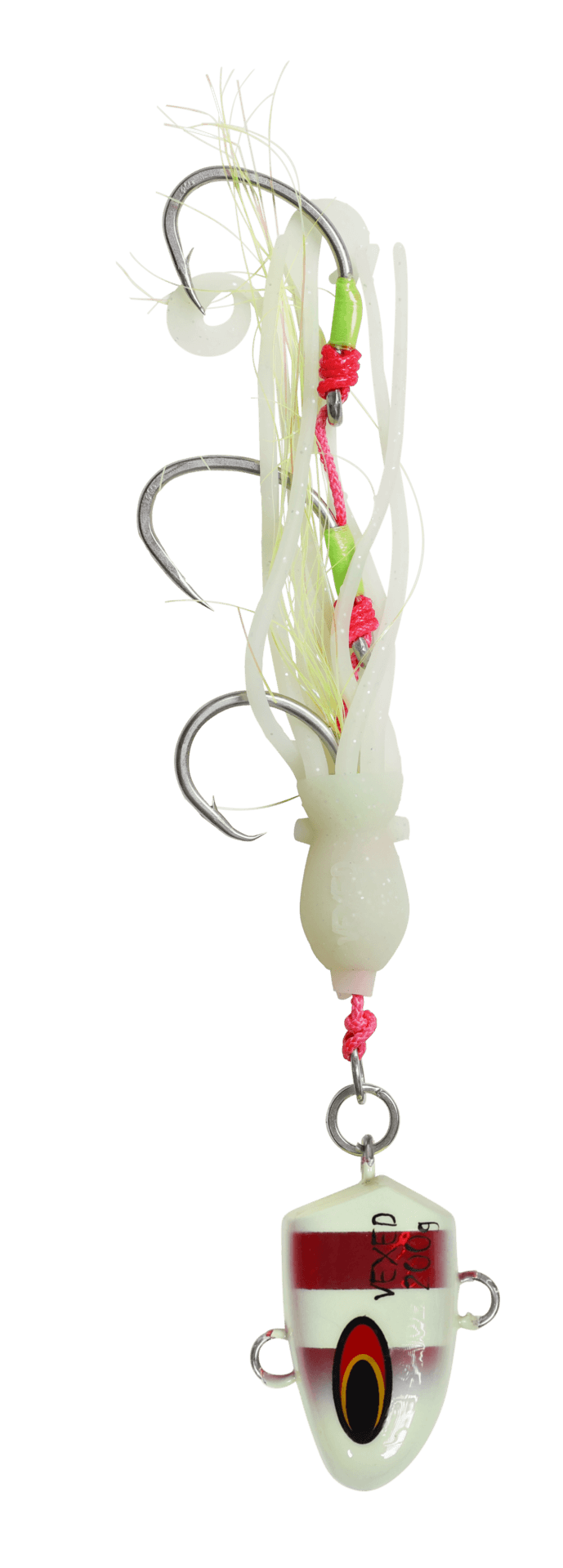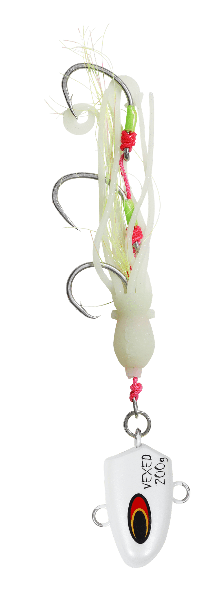 The Vexed Bottom Meat Deluxe is a great crossover concept mixing lure and bait fishing together simply bait up the hooks with a long strip of fish flesh, squid, octopus leg, pilchard or whole fish and send it to the bottom this design is great for any depth of water, The Bottom Meat Deluxe is fitted with super sharp hooks, Japanese assist cord and stainless rings. It now also has a Vexed super stretchy, high intensity glowing scented Occy Head Skirt with a burst of UV flash.