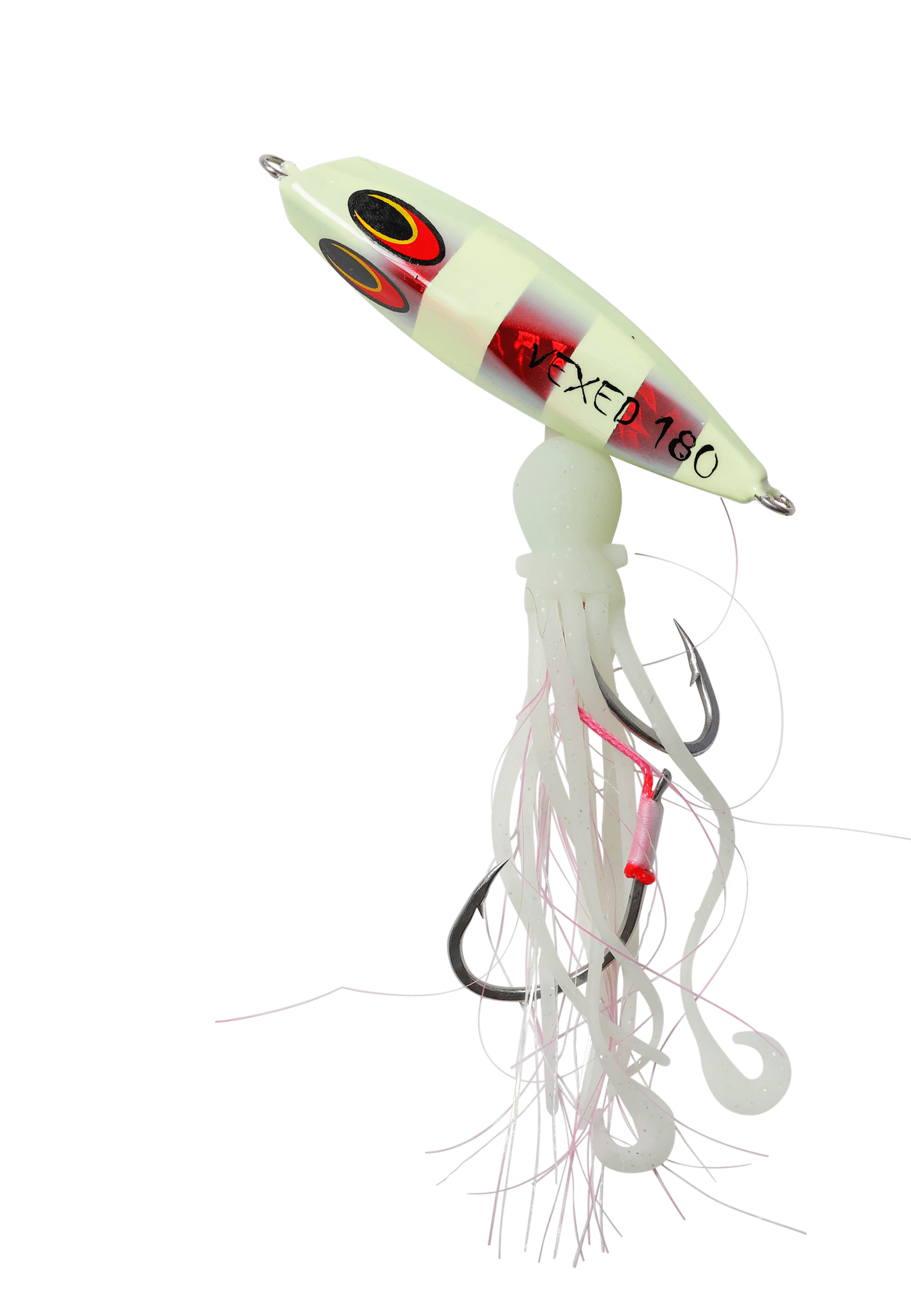 The Vexed DHU Inchiku is heavy and compact so the Jig drops down fast to where the fish are holding with large super sharp hooks and durable, scented, super stretchy, high intensity UV/Glow Flashy Occy Head Assist will draw plenty of attention and entice a bite.