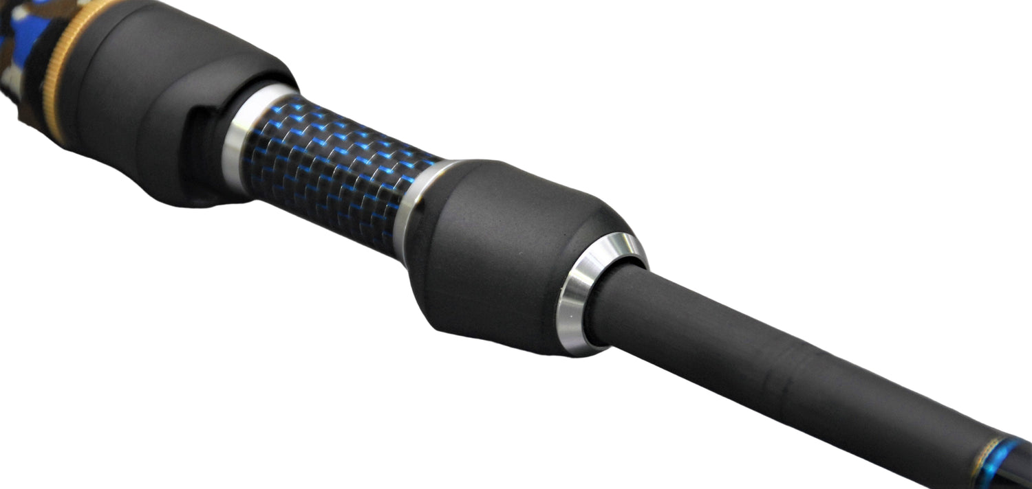 Ian’s trademark Control Freak style skeleton handle is super comfortable and also enhances the amazing sensitivity of this rod. This rod is fitted with the Fuji KSKSS seat, which makes vertical fishing extremely comfortable but retains the sensitivity factor. This is set atop a blue carbon barrel, and custom-shaped x-firm EVA in the Millerods signature style blue Camoufish pattern, all finished with the ‘M’ logo anti-skid butt cap.