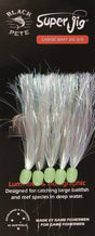 Popular and effective, quality bait fishing jig from Aussie game fishing tackle supplier - Black Pete Marine. Features luminous bead, holographic skirt & tough, long shanked, chemically sharpened hooks (nickel plated). For offshore game fishing.