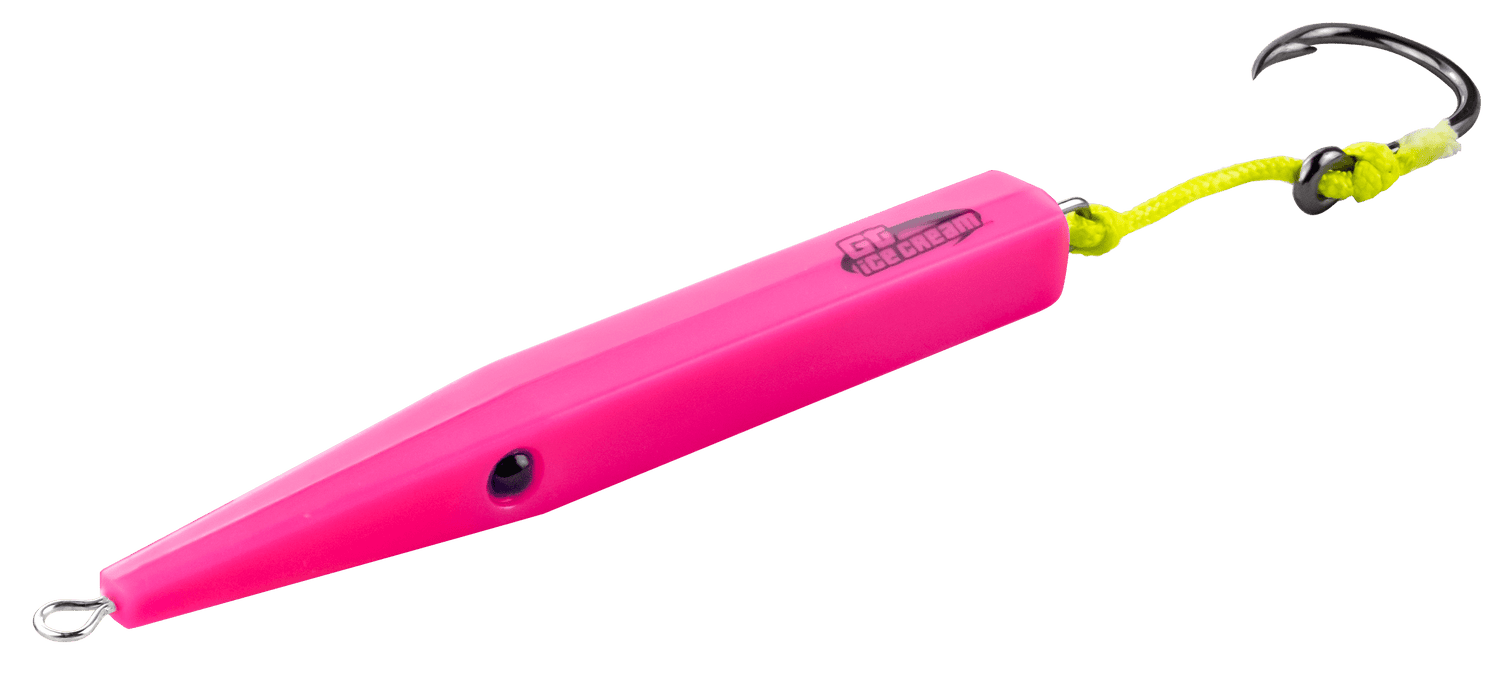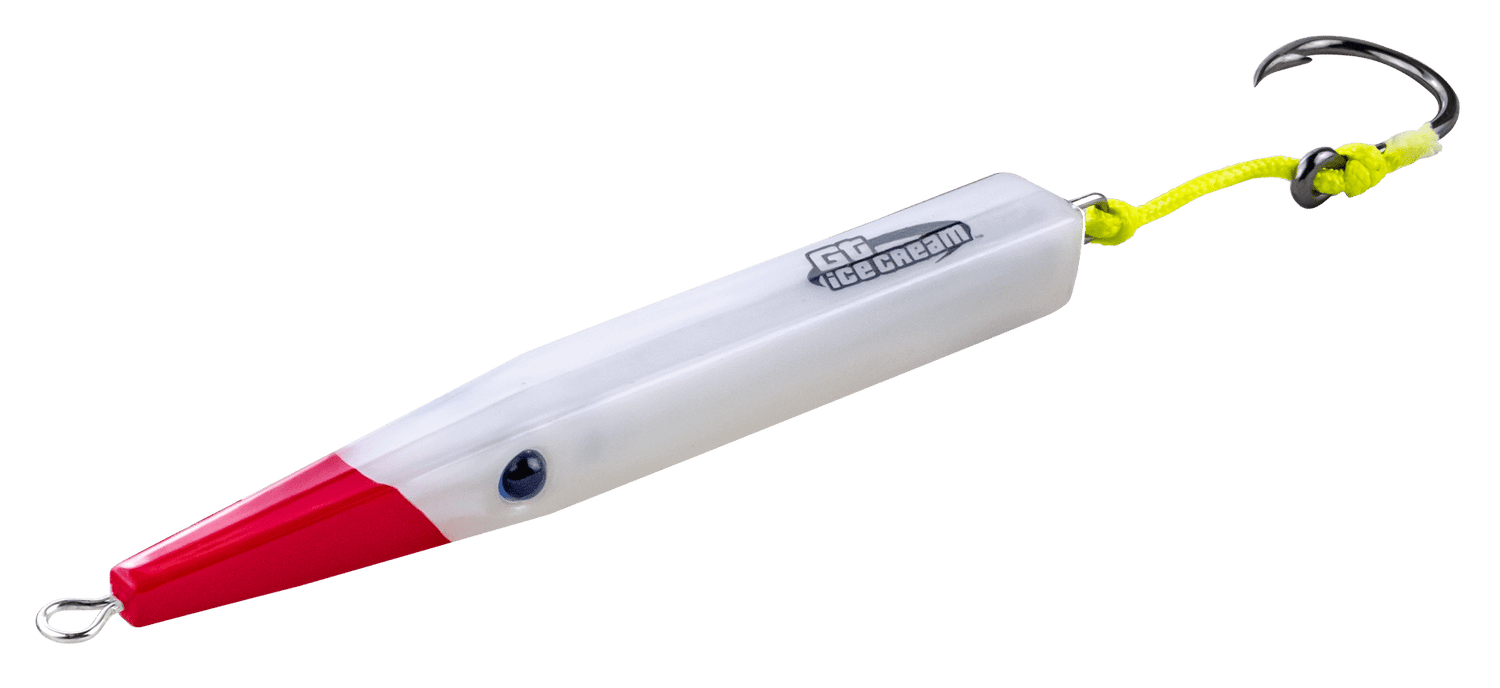 The whole series of GT Ice cream plugs feature a super strong, stainless steel, straight-through wire construction. All plugs are hand-made with Teflon, will not chip or crack and are resilient to rock damage. The natural white coloured Teflon makes our plugs imitate many of the baitfish species out there. Unlike wood, fish teeth slide right off ensuring a better hook sets. They are specifically weighted for distance casting and will fly very nicely into a strong onshore wind.