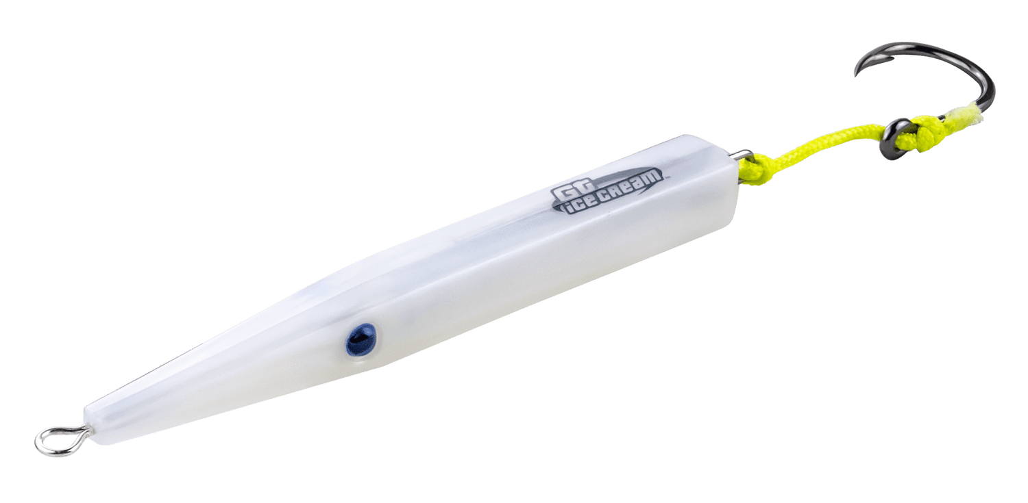 The whole series of GT Ice cream plugs feature a super strong, stainless steel, straight-through wire construction. All plugs are hand-made with Teflon, will not chip or crack and are resilient to rock damage. The natural white coloured Teflon makes our plugs imitate many of the baitfish species out there. Unlike wood, fish teeth slide right off ensuring a better hook sets. They are specifically weighted for distance casting and will fly very nicely into a strong onshore wind.