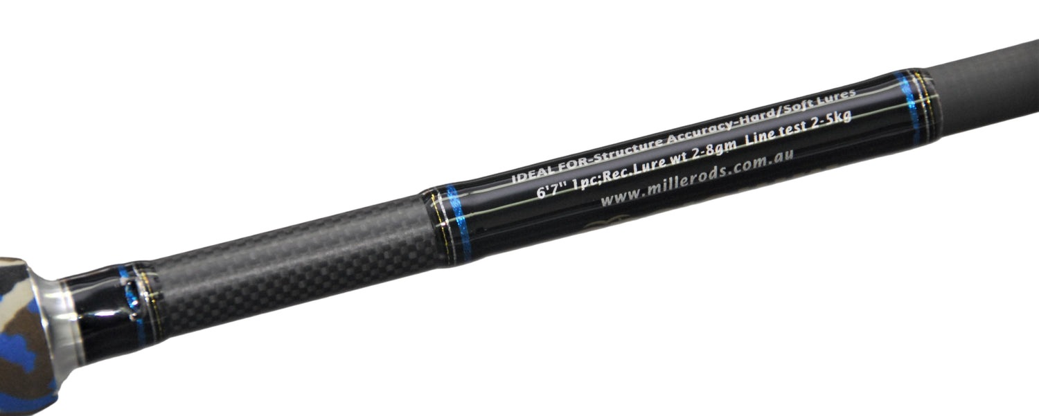 The Brawler incorporates Ian’s ‘Bream Buster’ style handles, comprising Fuji VSS reel seat with a custom carbon locking hood, and custom shaped x-firm blue Camoufish EVA, all finished with the ‘M’ logo anti-skid butt cap. This handle gives the angler a more positive grip for going hard on big fish!