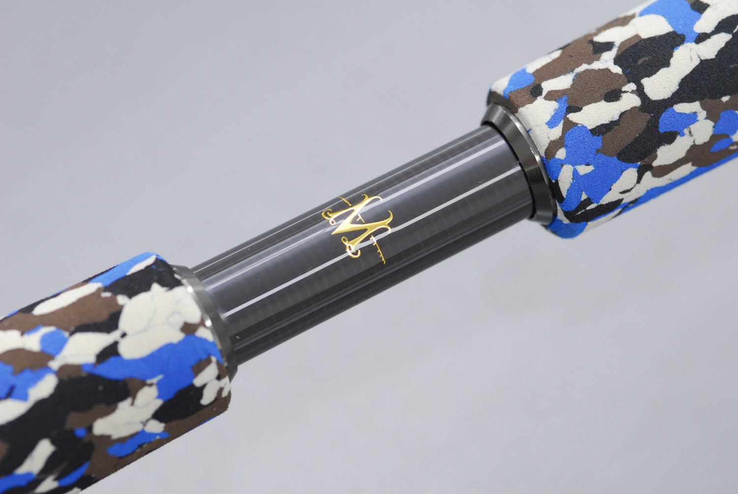 The fore grips are Ian’s original split grip design in x-hard blue Camoufish EVA. This unique design has several advantages, including a shorter grip next to the reel seat for general handling; a longer fighting grip for a higher reach to reduce leverage while fighting; the gap between grips allows for a positive grip when performing a hook-set, holding the loaded rod while positioning into a gimbal belt, and an easy option for wrapping a webbing attachment if a harness is needed.