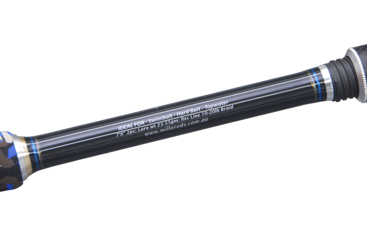 The skeleton handle utilizes a Fuji TVS seat for comfort and securely locking in the reel. The seat height is super comfortable for easy casting, and the butt grip is a long, custom-shaped x-firm EVA in the Millerods signature style blue Camoufish pattern. This is all finished with the ‘M’ logo anti-skid butt cap.