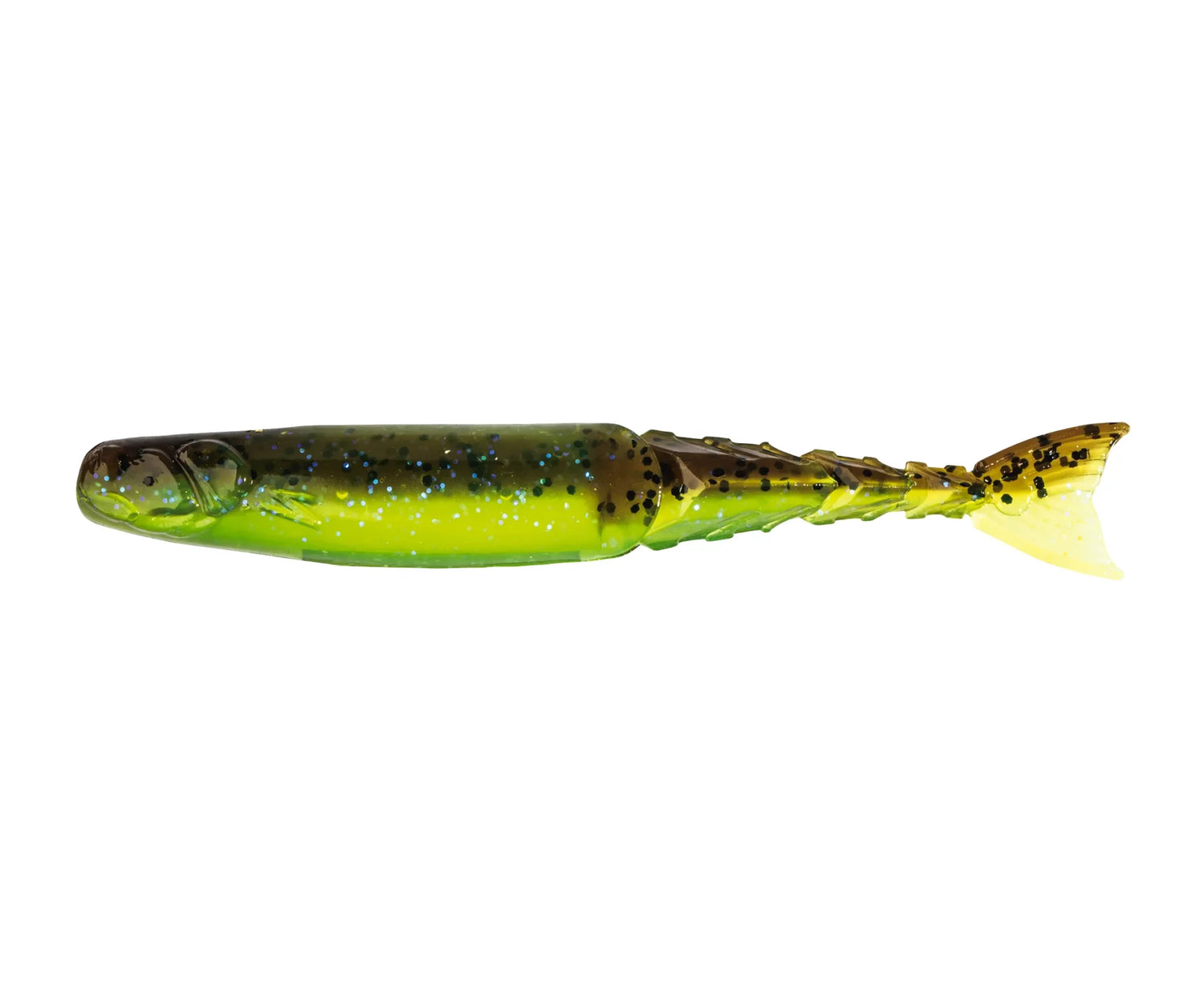 Not only a dynamic ChatterBait® or spinnerbait trailer, but an exciting stand-alone baitfish profile as well. The slim baitfish body and thin fan tail deliver an enticing life-like action, featuring a diamond-shaped cross section to enhance vibration, plus V-shaped ridges for added motion.